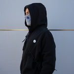 Black slim fit pullover hoodie made from deadstock 100% cotton Italian fabric. Designed for comfort and durability, with panelled side seams, premium rib on cuffs and hem, deep front-pocket and double-layer roomy hood.